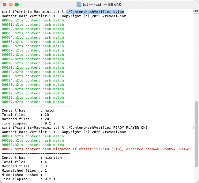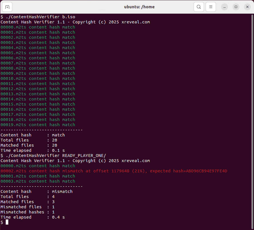 Version 1.2 2025-06-24 Added verify content hash of AACS 2.1 .fmts files Version 1.1 2025-02-18 Added support verifying content hash of .iso files Added -a switch, which will abort to verify the current m2ts file on mismatch hash Added -nologo switch to suppress copyright message Added -p switch to show the progress Version 1.0 2024-05-24 First public release