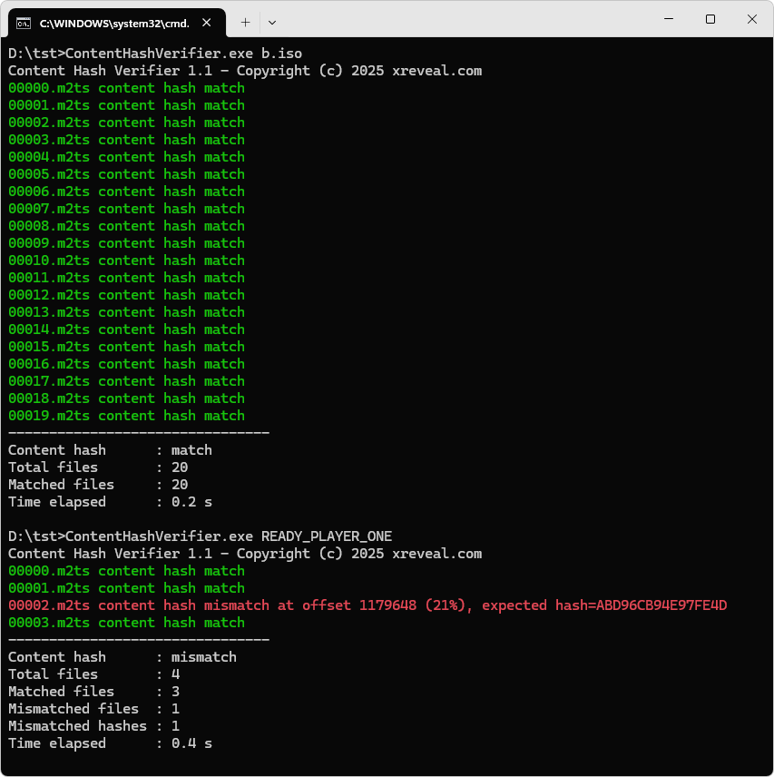 Version 1.2 2025-06-24 Added verify content hash of AACS 2.1 .fmts files Version 1.1 2025-02-18 Added support verifying content hash of .iso files Added -a switch, which will abort to verify the current m2ts file on mismatch hash Added -nologo switch to suppress copyright message Added -p switch to show the progress Version 1.0 2024-05-24 First public release